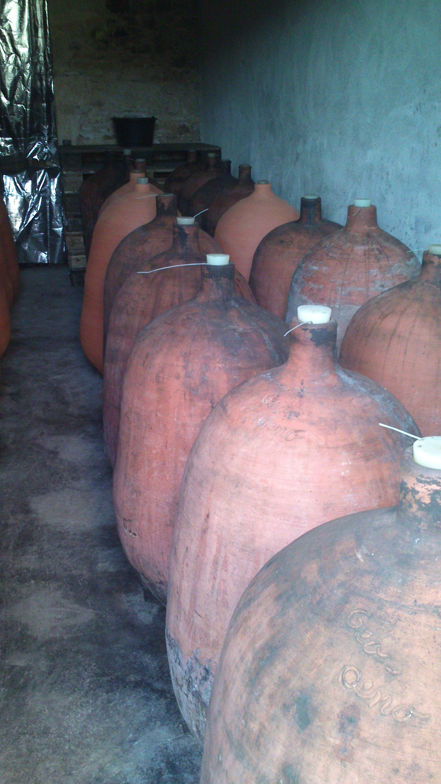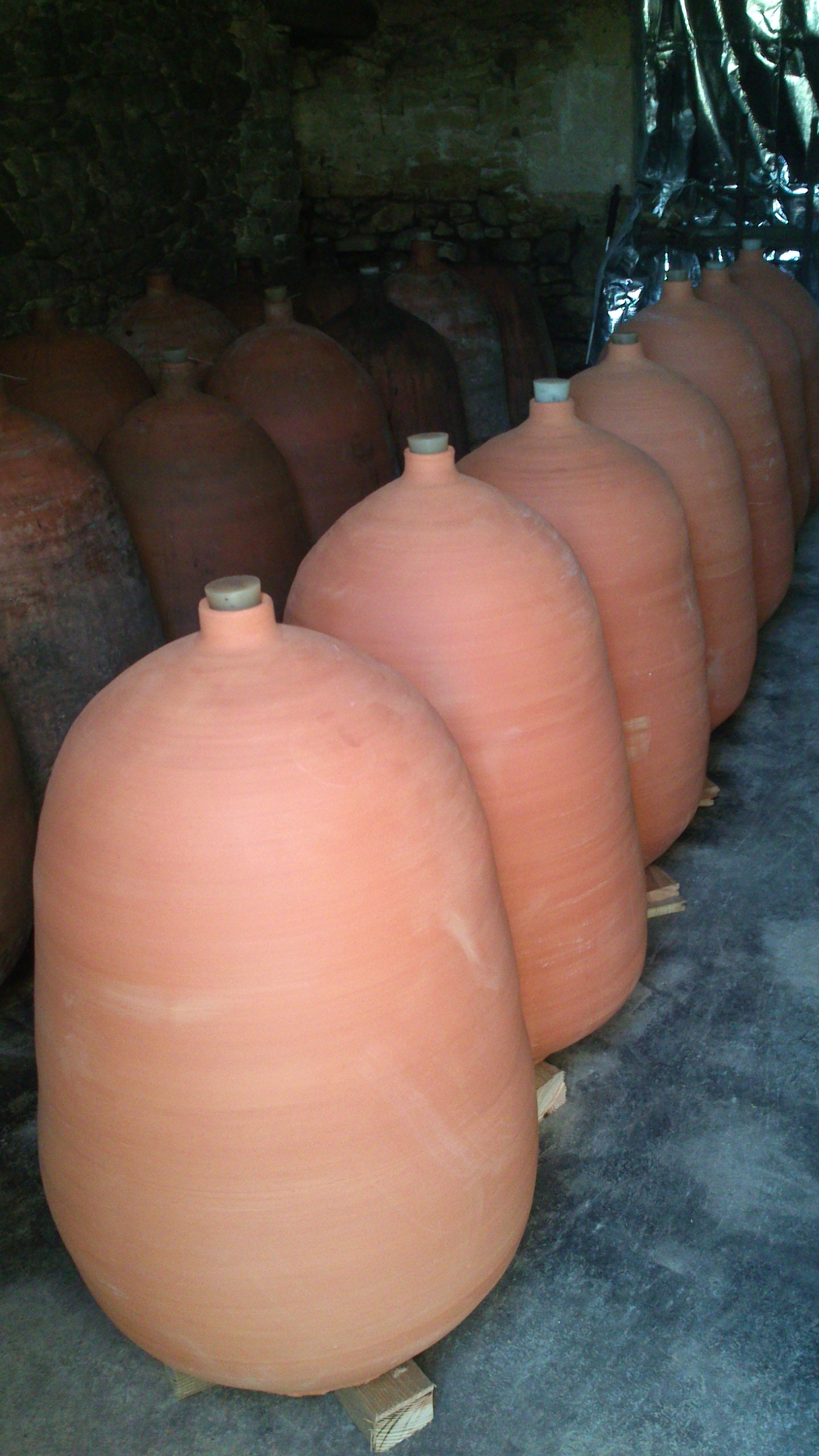 La fabrication est réalisée à la main par un artisan du Lot. D’une capacité de 140-150 l, elles ont une forme elliptique et une épaisseur de 1 à 1,5 cm. Le choix de la température de cuisson (supérieure à 1000°C) est fondamental car il permet de disposer d’une porosité adaptée (étanche au liquide et perméable à l’air), et donc d’un gain technique.